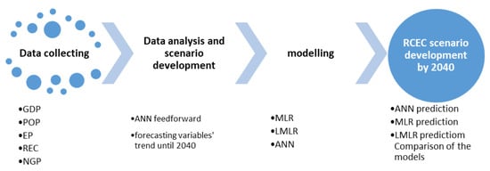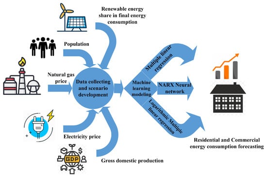 The process of modeling residential and commercial energy consumption in this paper includes four steps, which are presented in Figure 9. First, the POP, GDP, NGP, EP, and RESH datasets are collected from 1967 to 2017. Secondly, the growth rate of data and their trends are investigated to find a pattern for forecasting their future. Thirdly, the ANN feed forward model with multiple hidden layers is chosen to predict the growth of the variables. Based on the prediction of the ANN method, the growing behavior of the variables is forecasted by 2040. Finally, considering the prediction of variables, NARX, MLR, and LMLR models are developed to predict RCEC.