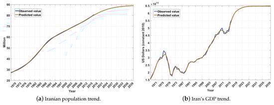According to the Iranian census center (https://www.amar.org.ir/english), population growth is 1.24% compared to 2011. In this paper, we forecast the population growth until 2040 using feed forward ANN model. The population growing trend (https://data.worldbank.org/) and ANN prediction results are presented in Figure 4a. According to Figure 4a, Iran’s population has been growing since 1967, and the highest growth rates happened between 1979 and 1991. Based on the ANN model prediction, Iran’s population will reach to 90 million in 2040.