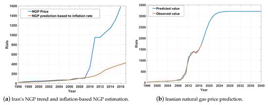 Table 1 presents the inflation rate, natural gas price and estimated natural gas price based on the inflation rate from 1991 to 2016. The estimated NGP for each year is equal to the estimated NGP value of a year before it plus the effect of inflation. Figure 5a also shows the estimation and actual growing trends of NGP with orange and blue colors, respectively. In addition, as depicted in Figure 5b, the NGP is expected to grow drastically and increase to more than 3200 Rials by 2040.