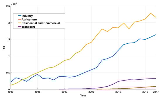 Iran’s RCED was 34% and 33% of total energy consumption in 2012 and 2017 [6], respectively, with the total energy consumption in the residential sector about 30% [13]. Energy consumption in Iran has been growing drastically, especially in the residential and commercial sectors [14]. Figure 1b shows the energy consumption in residential and commercial along with the consumption in industrial, transport, agriculture, and forestry sectors in Iran. Indeed, the drastic growth of population and economy that has been accompanying rapid urbanization had an essential effect on Iranian energy consumption [15]. However, the real value of energy carriers is not adequately assessed in Iran leading to a lack of inclination to invest in renewable energy sources. This has caused consistent use of fossil fuels which then have severe environmental damages [16].