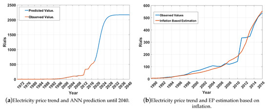 However, the trend of electricity price in the country is depicted in Figure 7b. It demonstrates the actual electricity prices in comparison with its estimation, which is based on the inflation rate and 1990 EP as the base year for estimation. It shows the fact that electricity prices followed the inflation-based price estimation. Hence, the Iranian government’s energy price policies were ineffective in controlling the electricity price and consequently the electricity consumption in residential and commercial sectors. In this paper, as shown in Figure 7a, the electricity price growth is forecasted by the ANN model until 2040. According to this forecast, the EP will reach 2200 Rials per KW by 2040.