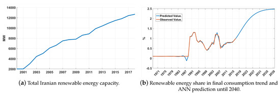 In this paper, the renewable energy share in final consumption is predicted by ANN by 2040. The trend of Iranian renewable energy share in final consumption [78], and the ANN prediction is also presented in Figure 8b. As illustrated in Figure 8a, the RE sources have a low share in final energy consumption, while RESH is anticipated to reach 2.5% by 2040.