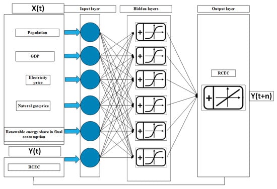 where is the predicted value of RCEC, are the past values of RCEC from t until , n is the number of time delays, and are exogenous inputs to the model which are POP, GDP EP, NGP, and RESH, respectively.