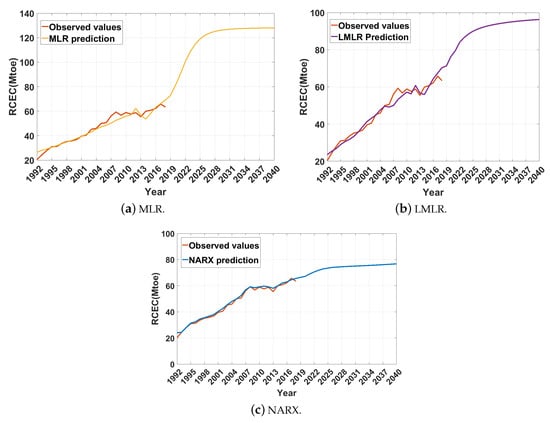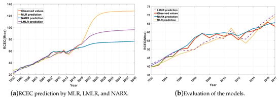The MLR method forecasts a drastic increase in RCEC while LMLR and NARX methods anticipate RCEC growth with a gentle slope.