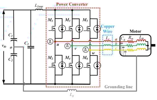 The scheme of a typical motor drive is shown in Figure 1. The power converter is constituted by three half-bridges, and each half-bridge contains two SiC MOSFETs. The cables are replaced by copper wires (), which connect between motor terminals and output nodes of the converter. Different from the cables, the impedance characteristic of the wire can be considered as inductive in a wide frequency range. The the CM propagation path is formed by connecting motor frame to the neutral point (o) with a grounding line (). Meanwhile, the CM coupling path between MOSFET and heat sink can be removed by using the separated heat sinks [21]. is the lumped stray inductance in the power circuit of the converter, which mainly contributes to the HF ringings on during switching transients. Consequently, based on the above descriptions, the CM equivalent circuit of the motor drive can be obtained (see Figure 2).