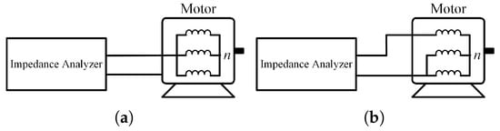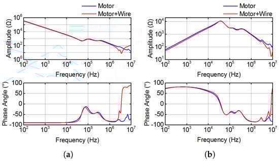 The HF impedance of the motor can be obtained with impedance analyzer. In this study, WK 6500B is adopted to measure the impedance of the motor from 100 Hz to 10 MHz. The measurement of CM and DM impedances of the motor is given in Figure 3. The CM impedance is measured between motor terminals connected together and motor frame, and the DM impedance is measured between the terminal of one phase and the terminals of the other two phases connected together [22]. And the measurement results of CM and DM impedances are shown in Figure 4. Figure 4a illustrates the CM impedance of the motor with and without connection wire and grounding line. With the influence of the wires and parasitic capacitors of the motor ( presented in Figure 1), the CM resonance is formed around 4 MHz. Similarly, the DM impedance of the motor () with and without connection wire and grounding line is shown in Figure 4b. The DM resonance which appears at approximately 8 MHz is also attributed to the equivalent inductance of the wires ( and shown in Figure 1) and . Both CM and DM resonances deserve much more consideration because they have played significant roles in determining and , which closely relate to the level of EMI.