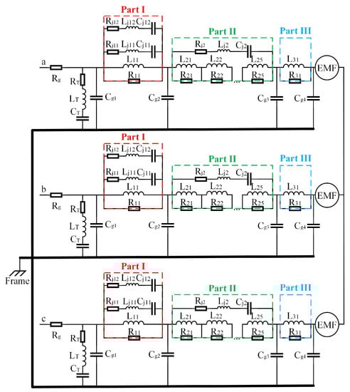 The impedance characteristics of the motor can be depicted through HF modeling. In this case, based on impedance curves and wingding configurations of the motor, an equivalent circuit (see Figure 6) is proposed to illustrate the impedance characteristics of the motor.