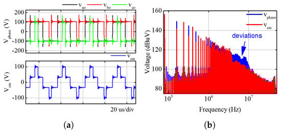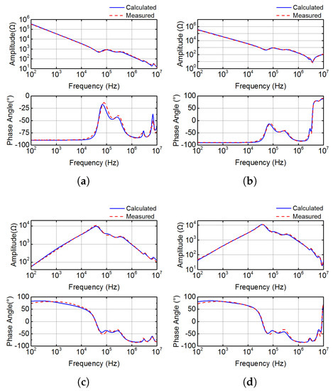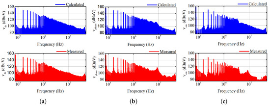 Figure 12b shows the comparison between calculated and measured spectra of . It can be observed that the measured spectrum of is less than that of the calculated ones from 5 to 10 MHz. This is mainly due to the ignorance of contact impedances of the connectors between inverter output nodes and copper wires in the model. Such contact impedance can induce some voltage drops at this frequency range (5∼10 MHz) in the measurement.