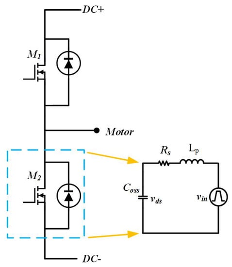 in which, , , represent converter output to ground voltage, which can be viewed as drain-source voltage of the SiC MOSFET because . The means the drain-source voltage of the low-side SiC MOSFET of the power converter, such as , illustrated in Figure 1.