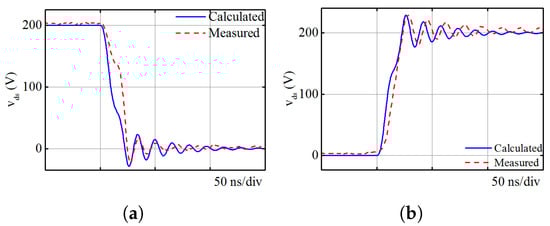 Figure 9 illustrates the comparisons between calculated and measured waveforms of during switching transient of the SiC MOSFET. According to operation principles of the SiC MOSFET, the slew rate of is determined by during current commutation, and the charging and discharging rate of the gate-drain capacitance is attributed to slew rate of during voltage commutation. Since the / is approximated as a constant value, the voltage rise and fall stages can not be accurately illustrated in the modeling. However, based on statement in [8], the spectrum envelop is mainly determined by rise and fall time ( and ) of the , which indicates that the model can correctly reflect the spectrum of because the calculated and are the same with the measured ones.