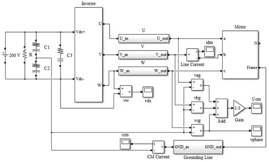 The simulation model of the motor drive is realized by Simulink (see Figure 10), which contains simplified model of switching action for SiC MOSFET, and HF model of the motor, connection wire, ground line. Furthermore, the SVM algorithm is also implemented with Simulink. The waveforms of , , , , and are obtained in the simulation.