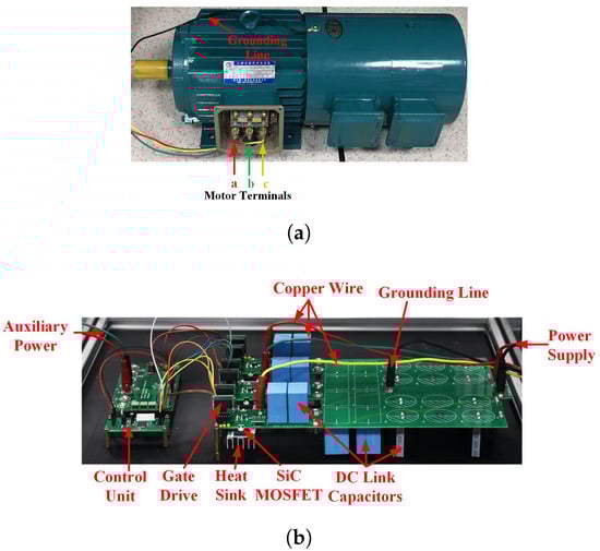 - The switching behavior of the SiC MOSFET is considered as the source of EMI. With the impacts of the resonances between copper wires, grounding line and parasitic capacitors, the HF harmonics of are changed, which leads to and . Then, with the influence of motor impedance, and can be determined accordingly. As a result, it can be confirmed that the resonances caused by copper wires, grounding line and parasitic capacitors, and motor impedance largely impact the level of EMI below 10 MHz in the motor drive.