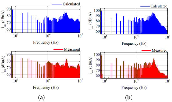 Figure 13 shows the calculated and measured spectra of and . The calculated and are fitted well with the measured ones, and the spectra peaks around 4 and 8 MHz can also be well reflected by the model. Therefore, it can be confirmed that the model can effectively predict the line current and CM current in motor drives.