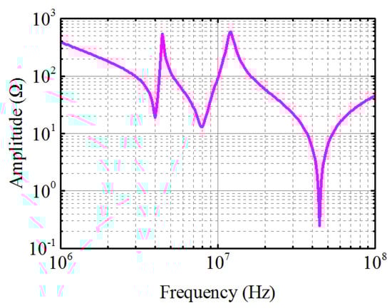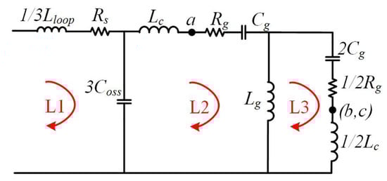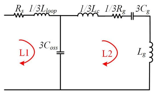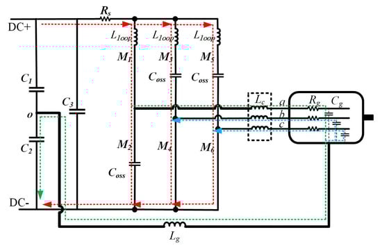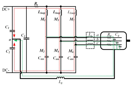 Three resonance loops (, , and ) can be observed in Figure 15, which mainly contribute to resonances shown in Figure 16. It can be observed that the LF resonances (less than 10 MHz) attribute to interactions between copper wire (), grounding line (), and parasitic capacitance of the motor (), and the HF resonance (around 45 MHz) owes to stray inductance in power circuit () and output capacitance of the SiC MOSFET ().
