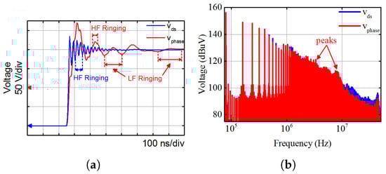 - Influence of motor impedance on EMI can be well demonstrated through frequency-domain analysis based on simulation results including the spectra of drain-source voltage of the SiC MOSFET (), phase to ground voltage of the motor (), CM voltage (), phase current of the motor (), and CM current (). Moreover, impacts of switching characteristics of the SiC MOSFET on EMI are also well investigated with relative experimental results in terms of switching speed, switching frequency, and switching ringing.
