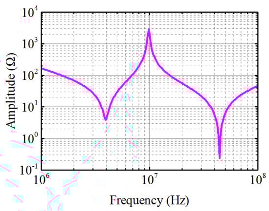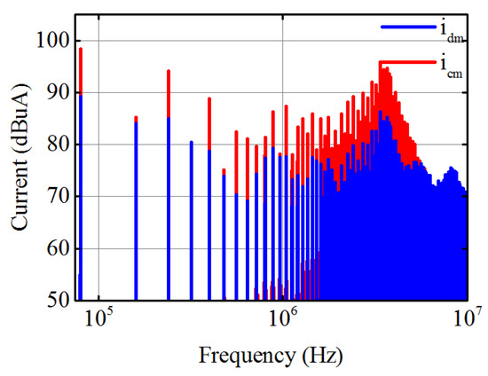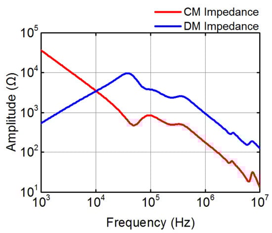 Figure 23 shows the calculated spectra of and . At lower frequency range (100 kHz∼5 MHz), CM impedance of the motor is far less than that of DM impedance (see Figure 24). Since the spectrum amplitude of is nearly the same with that of (see Figure 22b), the spectrum amplitude of is larger than that of in this frequency range. The peak component of (≃4 MHz) and lower CM impedance contribute to the spectrum spike of (≃4 MHz). The current spike on spectrum of is much lower due to the larger DM impedance. According to Figure 24, is almost 5–6 times from 100 to 5 MHz.
