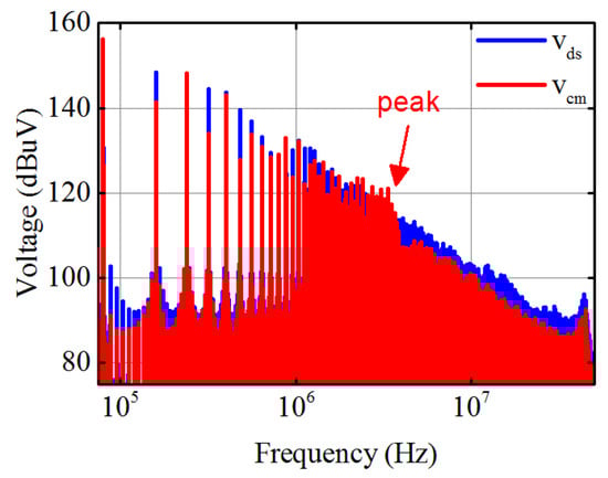 At higher frequency range (above 5 MHz), the spectrum of drops dramatically, and the deviation between spectrum amplitude of and is about 10 dBuV (see Figure 22b). Accordingly, the spectrum amplitude of attenuates faster. The peak component of (≃ 8 MHz) can be clearly observed due to the spectrum spike on . Although is still lower than , there is no spectrum spike on because spectrum amplitude of around 8 MHz is much lower than that of .