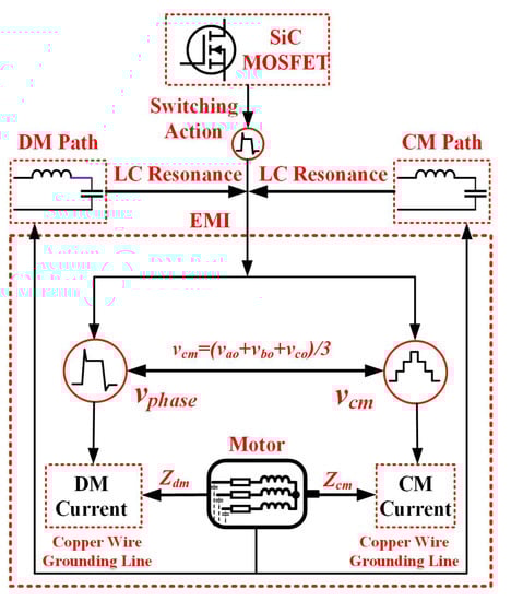 The EMI previously used in motor drives can always be represented by common mode (CM) voltage and CM current. The CM voltage can be considered as the origination of the bearing voltage [9,10]. Once the bearing voltage reaches its threshold value, it can cause electric discharge (ED) current that may damage the motor [10,11]. The CM current can flow into other electric equipment through grounding lines, which may significantly reduce reliability of the whole system. Meanwhile, the HF components of the CM current can reach the bearing through HF parasitic effect, which may induce premature bearing failure. In addition, the impedance mismatches between cable and motor accompanied with rapid switching speed of the SiC MOSFET, serious voltage surge can also be observed on motor terminals, which may lead to severe electric insulation issue of the motor [12,13].