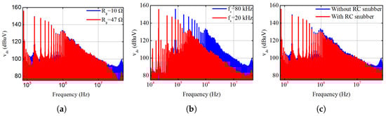 Spectra of the drain-source voltage of the SiC MOSFET: (a) = 10 and 47 , (b) = 80 and 20 kHz, (c) with and without RC snubber.