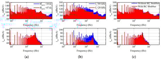 Figure 26c compares the spectrum of with and without RC snubber. It is obvious that the added RC snubber can effectively mitigate the HF switching ringing, and alleviate the amplitude of the spectrum at HF range (above 30 MHz). As a result, the spectrum peak around 45 MHz on is disappeared with the added RC snubber (see Figure 27c).