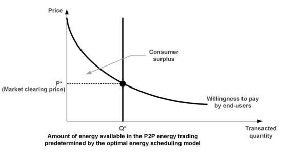In the proposed scheme, the price bidding is prohibited and an hourly amount of energy available in the P2P energy trading is derived by the optimal energy scheduling model. Under the fixed P2P trading quantity, giving a preference to end-users with higher willingness to pay for electricity would entail maximizing the consumer surplus [20,21].