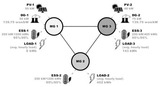 For a comprehensive case study, the hypothetical multi-microgrid test bed will be organized with several electric facilities installed in the Korea Electrotechnology Research Institute. The simplified structure of the system, technical properties of each electric equipment, and averaged hourly load demands in independent microgrids are vividly revealed in Figure 4. It is, for simplicity, assumed that each microgrid stands for one energy prosumer and mutual energy exchange is achieved by virtual tie-lines adjoining each other while considering the hourly P2P energy trading in June of 2018.