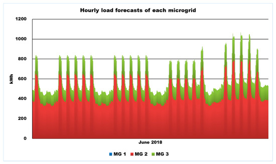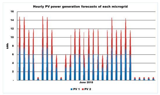 Figure 5 and Figure 6, respectively, display hourly photovoltaic power generation forecasts and hourly load forecasts of every microgrid that will be deployed as a part of multiple input data for simulation.