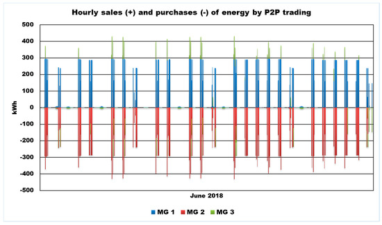Hourly sales and purchases of energy by P2P trading over the full trading period.