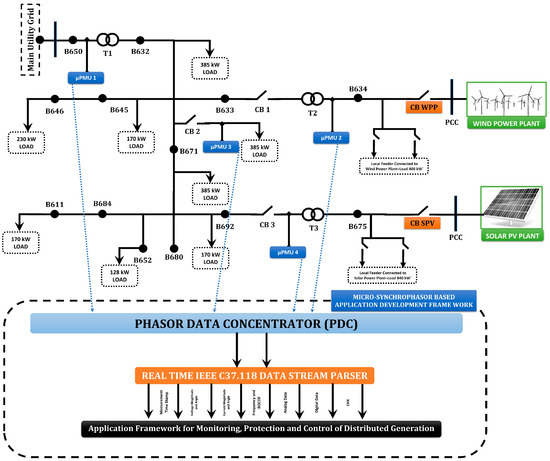 The IEEE 13—node distribution test feeder [50,51] is a standard distribution system test model developed by the IEEE Power Engineering Society. The operating voltage of the distribution feeder is 4.16 kV at a power frequency of 60 Hz. The distribution system components modeled in the test feeder includes overhead lines, underground cables, spot loads, distributed loads, capacitors, transformers, and regulators. A single line diagram of the modified IEEE 13—node distribution test feeder as described in the article [52] is shown in Figure 1. In the modified test system, DGs like a wind and a solar PV power plant is integrated into the feeders at nodes B634 and B675 respectively. Also, micro-synchrophasors are incorporated at PCC of each DG, utility grid, and load terminals. The data from µPMU is transferred to Phasor Data Concentrators (PDCs) in the IEEE C37.118 format, which is further processed in the micro-synchrophasor application-based framework.