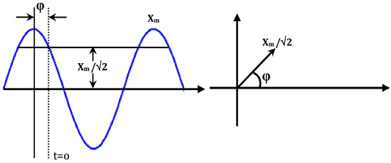 The magnitude of the estimated phasor is the root mean square value of the sinusoidal input signal Xm/√2, whereas the phase angle is φ. The phasor representation of a sinusoidal signal is illustrated in Figure 5.