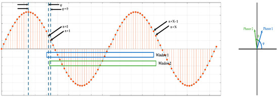 Phasor estimates of the window 1 are represented as phasor 1 and window 2 are represented as phasor 2. The first sample in window 1 lags the peak of the sinusoidal signal by an angle φ, while the first sample of window 2 (n = 1) lags the peak by an angle (φ + θ), where, θ is the angle difference between the samples [53]. The non-recursive type phasor estimation is shown in Figure 6.