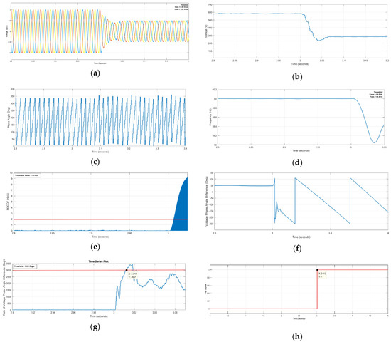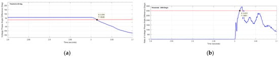 The starting characteristics of the three-phase induction motor is studied for its impact on the proposed IDM. A 2.4 MW induction motor load is configured at node B634 for this purpose. A cumulative load of 10 units of 320 HP induction motors is connected across two local feeders at this node. Due to inrush currents at the time of starting, the voltage decreases below the nominal value, and hence, ROCOV values have exceeded the threshold limits, due to which under-voltage relay and ROCOV had detected the unprecedented condition. The system frequency is not affected under this scenario and hence, frequency and ROCOF relays have not responded to it. Under these inputs, the first AND gate maintained its low binary state. The values of the VPAD module are found to be greater than 30° and the ROCOVPAD values are below the threshold limits. With reference to the above inputs, the second AND gate maintained its low state, and the status of the OR gate remains unchanged. Hence, the proposed algorithm remained stable for induction motor starting characteristics. Since the values of VPAD and ROCOVPAD are the deciding factors of the proposed algorithm, the graphs corresponding to VPAD and ROCOVPAD are shown in Figure 14a–c.
