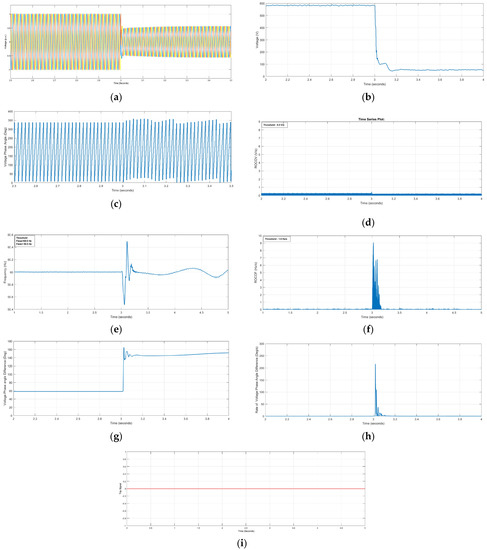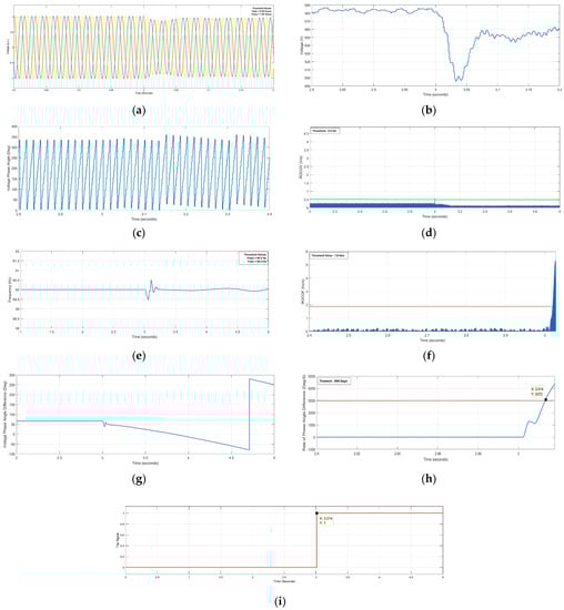 Due to these input conditions, the output of the first AND gate remain in low binary state. The VPAD values are higher than 30° and the ROCOVPAD module does not meet the threshold condition of 3000 deg/s and hence both the relays are at a low binary state. With these inputs, the output of the second AND gate is set to a low binary condition. The OR gate also maintains its low state under these conditions and hence, no trip signal is generated under load shedding condition. Hence, the proposed method does not operate under load shedding condition which is a non-islanding scenario. The graphs representing various relay outputs are shown in Figure 13a–i.