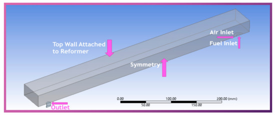 - Adiabatic conditions are assumed at all the boundaries of the combustor except for the wall adjacent to the reformer (top wall in the geometry).