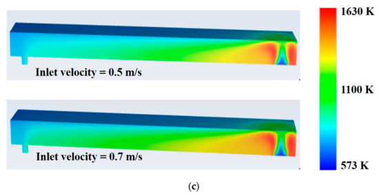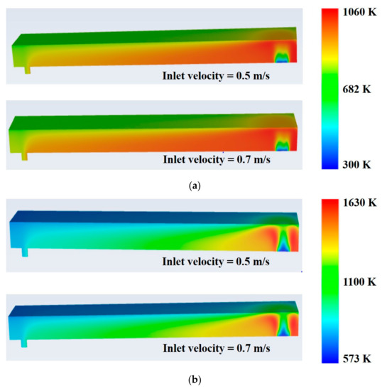 - Feed inlet velocity of 0.7 m/s is found to be superior to 0.5 m/s regarding improvement in thermal efficiency of the combustor.
