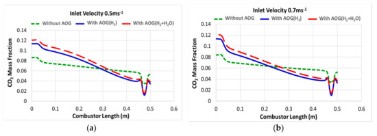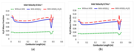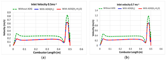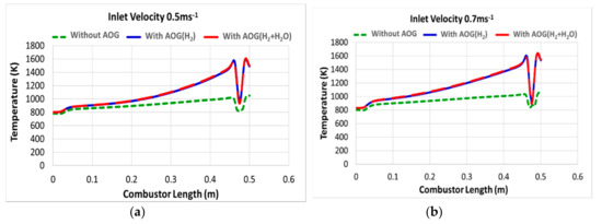 - Average temperature of the combustor is found to have increased by 130 K at 0.5 m/s inlet velocity and 164 K at 0.7 m/s inlet velocity with AOG utilization (case II).