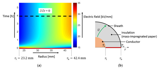 where ε0 = 8.854 × 10−12 As/(Vm) is the dielectric constant, εr is the relative permittivity and is the electric field and temperature T dependent electric conductivity, a stationary electric field is obtained at approximately 10∙τ. Due to the non-linear electric conductivity, a stationary field may be obtained after hours or weeks [1,3,13,14]. For example, Figure 1a shows the electric field within a MI insulation with conductor temperature T(ri) = Ti = 55 °C, sheath temperature T(ra) = Ta = 35 °C and applied voltage U = 450 kV. A stationary electric field is seen above the black dashed line. The cylindrical geometry is depicted in Figure 1b, where the electric field is computed along the red evaluation line due to its radial dependency only [11,13].
