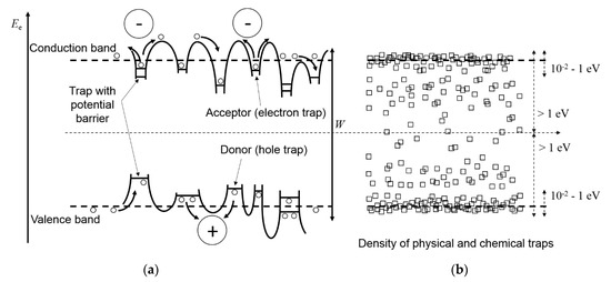 The traps are called “physical traps” or “shallow traps” and “chemical traps” or “deep traps”, depending on the trap depth. For XLPE, shallow traps have a depth of 10−2–1 eV, while the depth of deep traps is >1 eV [17,20,21]. The density of the traps is high near the conduction and valence band and decreases with increasing distance, as illustrated in Figure 2b.