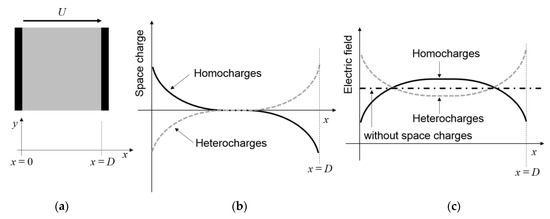Space charges accumulate within the material due to injection processes, the ionization of impurities, the polarization of the material, and a varying ratio of permittivity over conductivity [8,35,36]. Homocharges are located near the electrode with the same polarity and heterocharges are located near the electrode with the opposite polarity. The effect of both charge distributions on the resulting electric field, between planar electrodes with distance D and applied voltage U, is depicted in Figure 3. Homocharges decrease the electric field at the electrodes and increase the field within the bulk. Heterocharges increase the field at the electrodes, while it is decreased in the bulk (see Figure 3b,c) [2].
