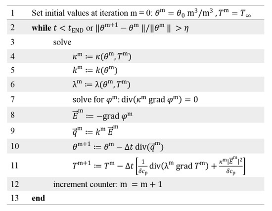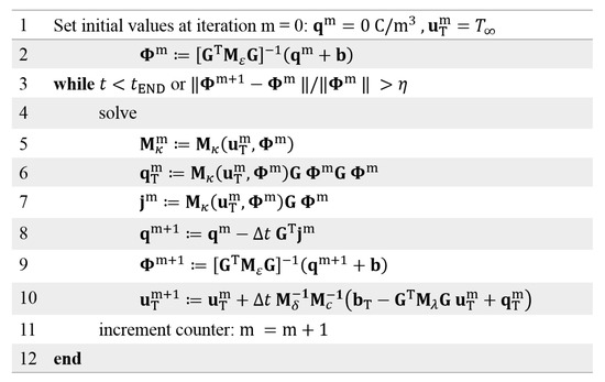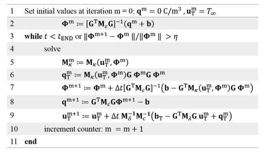 where Mδ is the density matrix, Mc is the matrix of the specific heat capacity, Mλ is the thermal conductivity matrix, qT = Mκ(uT,Φ)GΦGΦ is the vector of heat sources and bT contains the boundary conditions for the thermal problem [48,49,60,61]. A possible calculation scheme to obtain the electric field and the space charge density, using (8)–(10), is depicted in Figure 4 and using (11) in Figure 5.