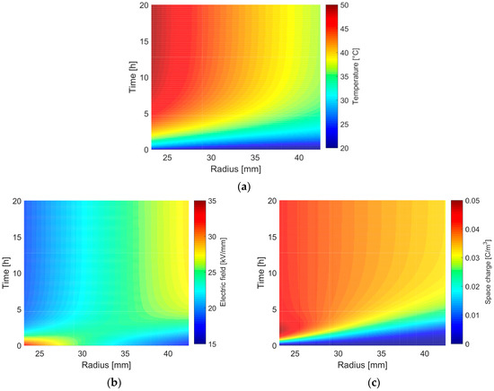 (a) Transient temperature distribution within a MI insulation; (b) corresponding transient electric field stress; (c) corresponding transient space charge density.