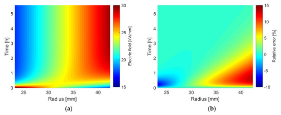With an electric field depending time constant, an approximation for τ is determined with the mean electric field U/(ra − ri). Using (7), the constants in Table 1 and the temperature distribution (28), with Ti = 50 °C and Ta = 35 °C, the numerically computed solution and the relative error of the approximation (35) are depicted in Figure 7. The relative error of (35) has the highest values in the vicinity of the conductor and the sheath, during the inversion of the field. The maximum error is about +13.58%. If the electric field approaches the stationary solution, the error decreases and is close to zero.