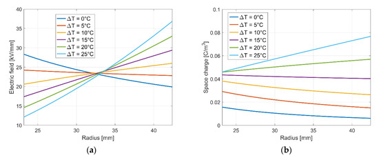 With (24), a varying electric conductivity, either by a varying electric field and/or temperature or other processes will automatically result in accumulated charges [14,26]. For a radial symmetric electric field E(r), space charge ρ(r) and temperature profile T(r), (24) is reduced to: