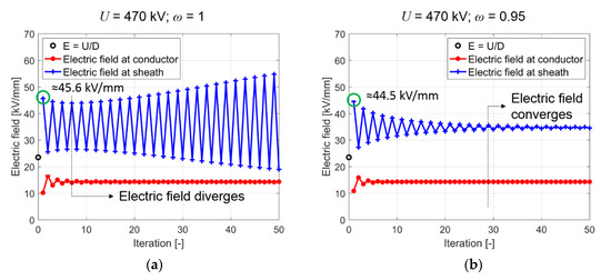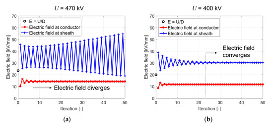 Electric field at the conductor and the sheath in a 20 mm-thick MI insulation. (a) with an applied voltage of U = 470 kV, the electric field diverges after 5 iterations; (b) with a reduced voltage of U = 400 kV, the electric field converges [71].