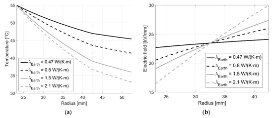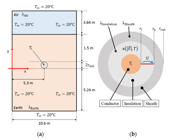 where the constants κ0 and α are equal to (6), but the electric field dependency is determined by the constants ERef and v. Considering a cable geometry, as depicted in Figure 1b, the approximations ERef = U∙exp(−1)/(ra − ri) and v = U∙β/(ra − ri), with ri as the radius of the conductor and ra as the radius of the sheath, hold true [25,26,30].