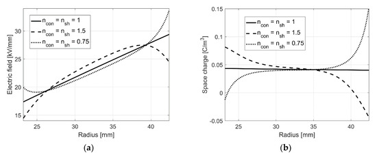 Within the insulation, a homogeneous electric field is desirable. To obtain a homogeneous electric field, δE needs to vanish, resulting in E(r) = U/(ra − ri). With (30), δE vanishes at a temperature gradient Ti − Ta = ln(ra/ri)/α ≈ 6 °C. Utilizing (33) this temperature gradient corresponds to losses of PV = 2πλ/α ≈ 10.5 W/m, with λMI = 0.167 W/(Km) [30]. With losses higher than 10.5 W/m, the field inversion increases and with lower losses the electric field is higher at the conductor in comparison to the field at the sheath [70]. The temperature coefficient α is approximately equal for XLPE and MI, but the thermal conductivity of XLPE is higher (λXLPE = 0.27–0.32 W/(Km)) in comparison to MI. Using an equal XLPE cable insulation, the losses are PV ≈ 17–20 W/m to obtain a homogeneous electric field. Thus, a better heat dissipation of XLPE results in higher transmitted power until the risk of high field values at the outer sheath occurs [5]. According to [25,26] the charge density is separated into two parts. One corresponds to the temperature dependency of the electric conductivity (ρT) and one corresponds to the electric field dependency (ρE). With a given temperature gradient both charge parts are of the opposite sign. With increasing field dependency (v) the effect of field inversion decreases, but the net charge density (|ρT| + |ρE|) increases. In comparison to MI, the electric field dependency of XLPE is 3.5 times higher [30,31]. Thus, the net charge density (|ρT| + |ρE|) is higher in polymeric cable insulations, whereby XLPE usually operate under lower applied electric fields [2,3].