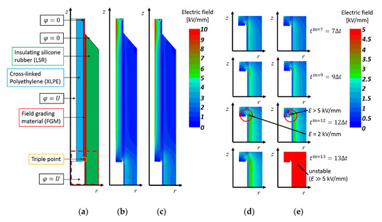 - Mauseth, F.; Haugdal, H. Electric Field Simulations of High Voltage DC Extruded Cable Systems. IEEE Electr. Insul. Mag. 2017, 33, 16–21. [Google Scholar] [CrossRef]