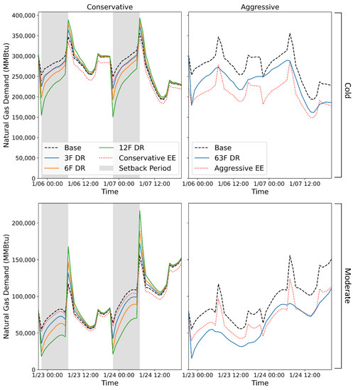| Aggressive DR | Setback homes to 63 °F (48 h) | Homes with existing setpoints > 63 °F (96%) |