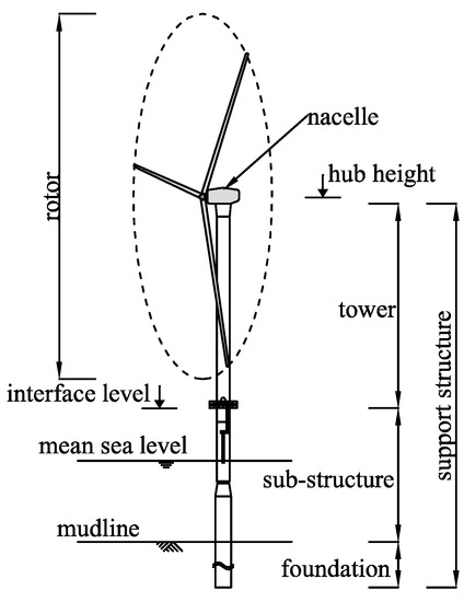 Schematic representation of a three-bladed monopile-based offshore wind turbines with the definitions according to DNVGL-ST-0126 [13].