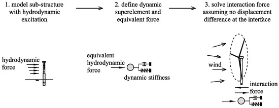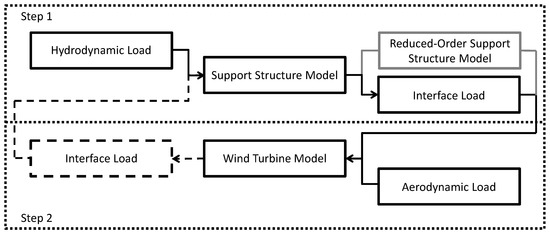 After defining the preliminary design of the support structure, the procedure starts with a model of the foundation structure, which is exposed to the hydrodynamic loads (Step 1 in Figure 2). Subsequently, the model—or a reduced-order representation—and the response at the interface with the wind turbine are shared with the turbine designer, who evaluates the structural response of a wind turbine model to the aerodynamic excitations (Step 2). The response at the foundation interface can then be used to re-evaluate the structural model of the foundation structure, after which an updated foundation model initiates a subsequent design loop. Ref. [28] provided a detailed description of this design sequence, and [29] specifically addressed the derivation of equivalent interface forces, which are to be shared between the different design parties.